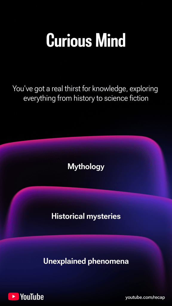 Yet another 2025 post, and it’s not the last one! I watch more YouTube than any other kind of AV media, and my YouTube Recap finally arrived on Xmas Eve, after I’d given up on ever seeing it. It was… interesting. I wasn’t happy with the fact that the channels I watch that debunk conspiracies were lumped under ‘urban legends’ as if I were a believer, but oh well. I couldn’t argue with the overall summary.