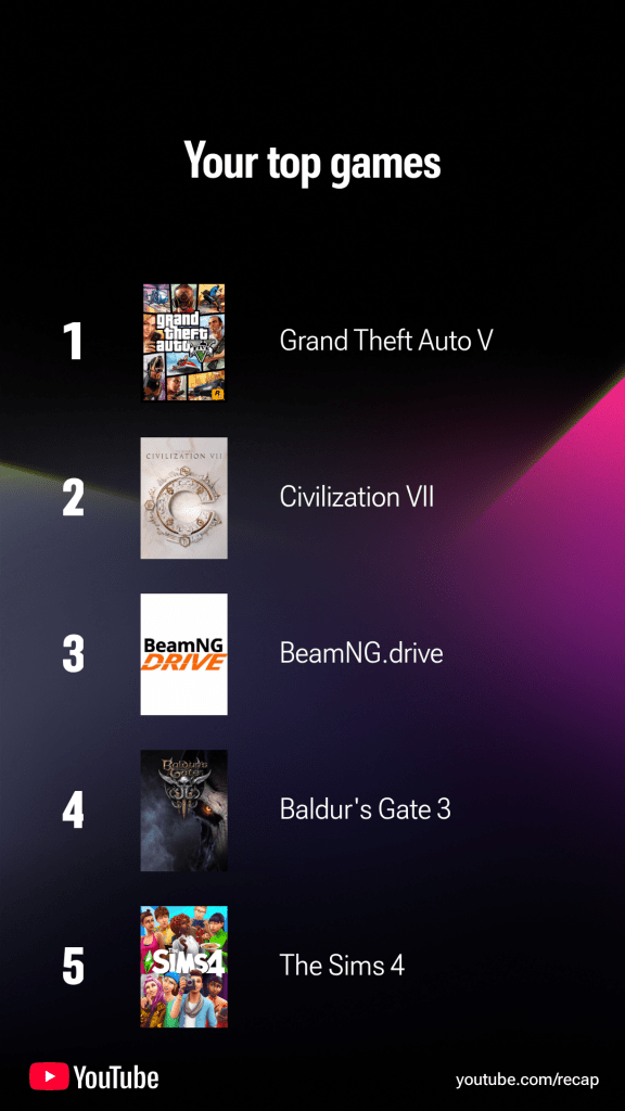 Amusingly, I’ve never played the top three games it lists for me, although it’s completely true in its assessment of what I’ve watched. The GTAV and BeamNG listings are almost entirely due to Failrace and the associated channel Leathercap (the only YT channel I’m actually a member of). Failrace specialises in wacky races and other improvised games played with vehicles inside games. Alex (the channel owner) and his filming crew are very British, very banterific and unusually LGBTQ friendly (if you can take the banter. It’s a British thing).